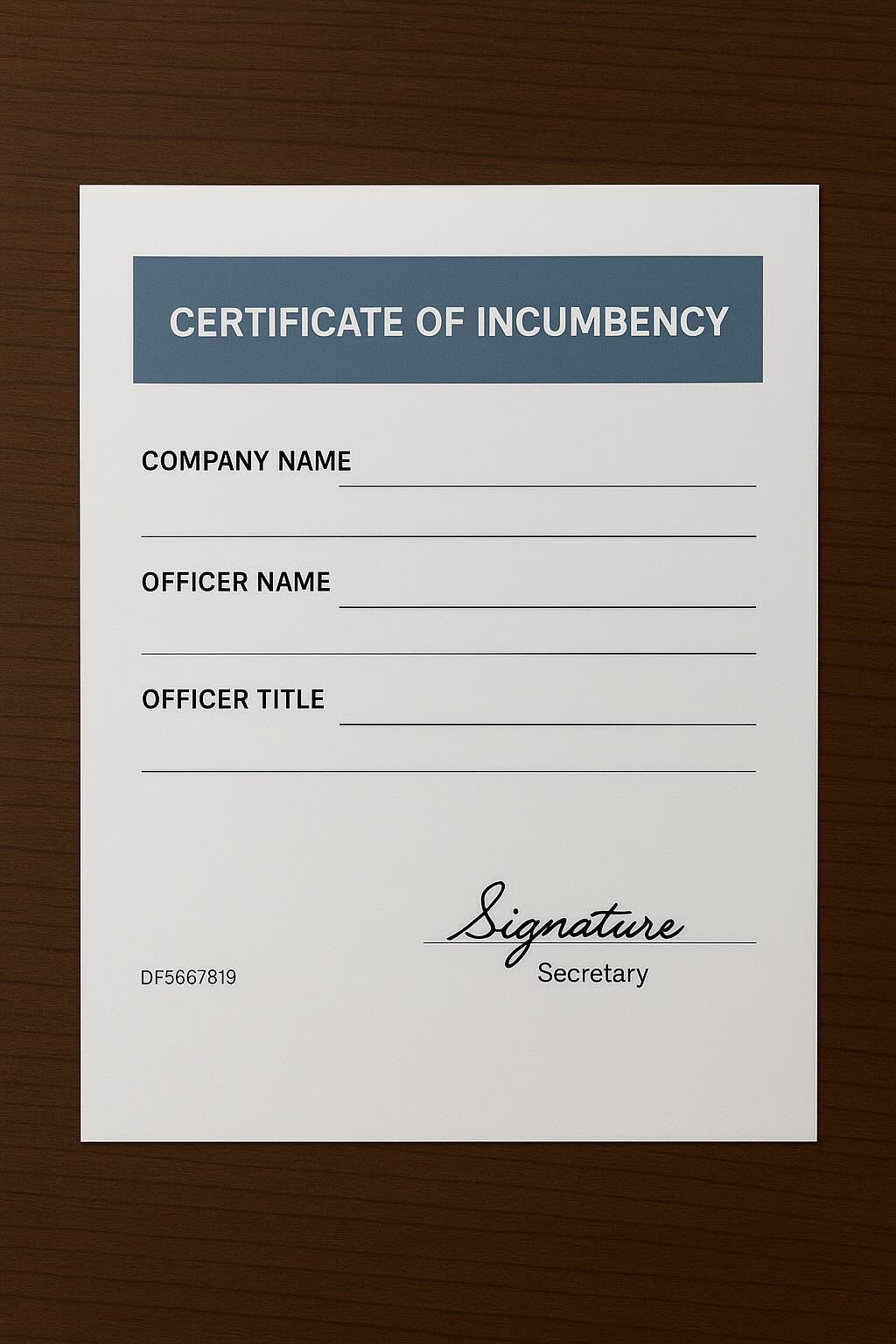 This document is frequently required for international business transactions, opening foreign bank accounts, authorizing overseas contracts, establishing branch offices abroad, and validating company authority in foreign jurisdictions. A Certificate of Incumbency may also be called: